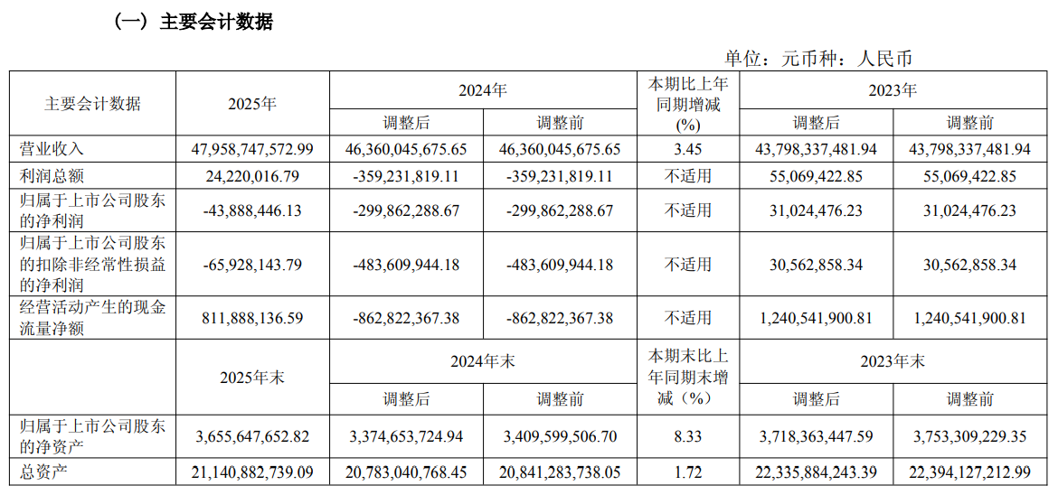 (600973)发布2025年年报,2025年度公司实现营业收入479.59亿元,同比增长3.45%;归属于上市公司股东的净利润亏损4388.84万元,去年同期亏损近3亿元,同比亏损幅度缩窄。